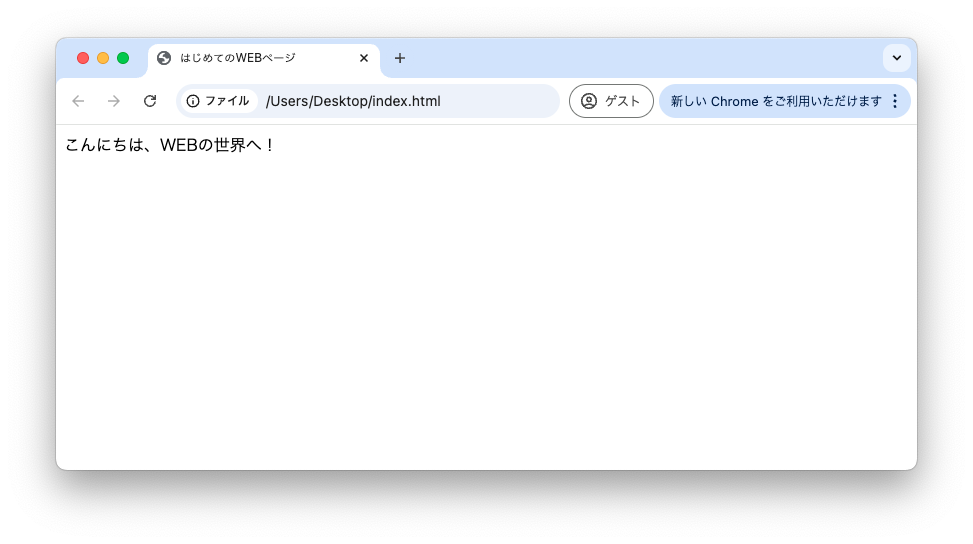 </html>このファイルを sample.html という名前で保存し、ダブルクリックして開くと、ブラウザが自動的に起動して、「こんにちは、ワールドワイドウェブ!」と表示されます。