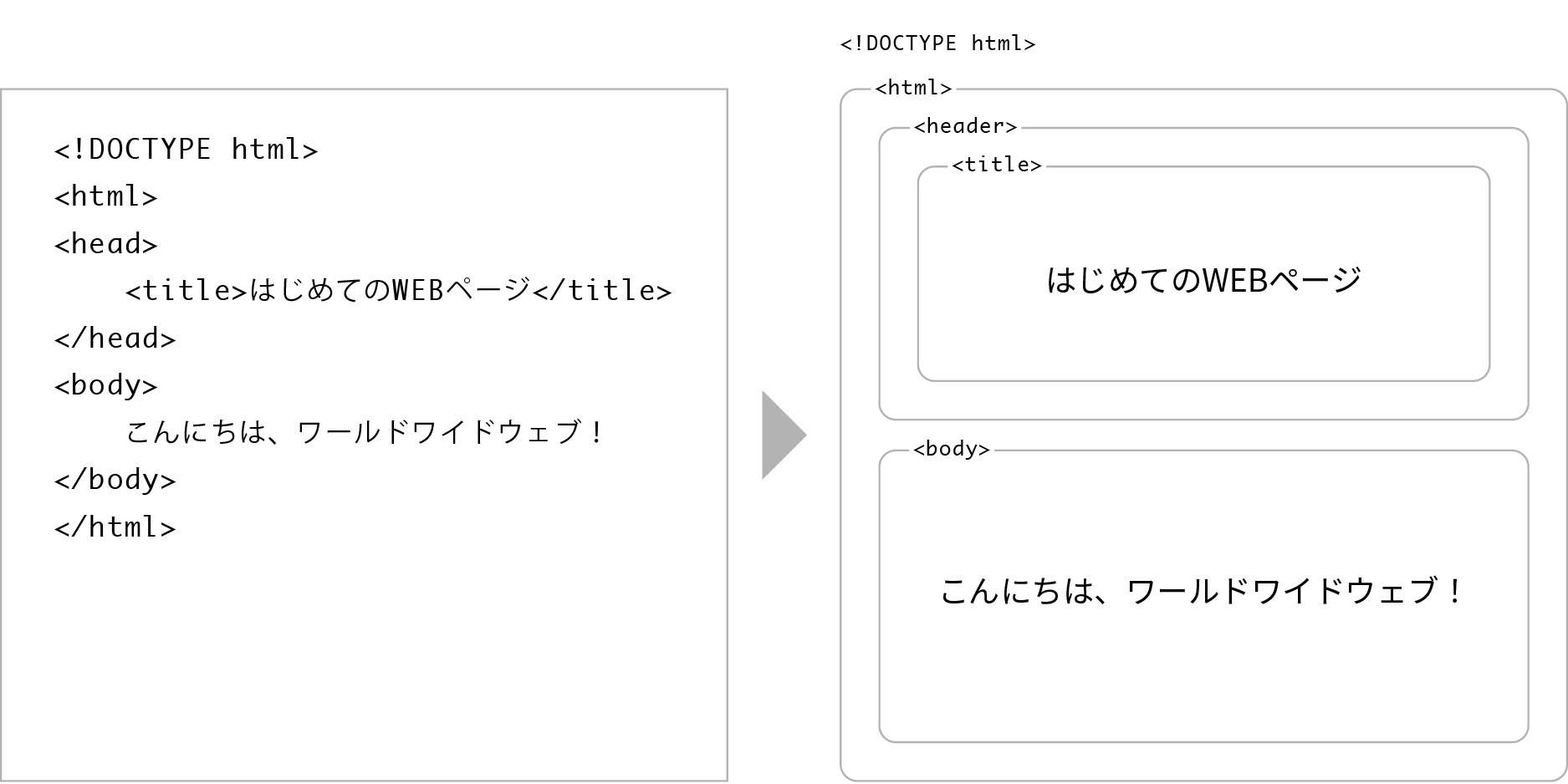 <html>,<head>,<body>など)があることで、ブラウザはどの部分が何の役割なのかを判断できる